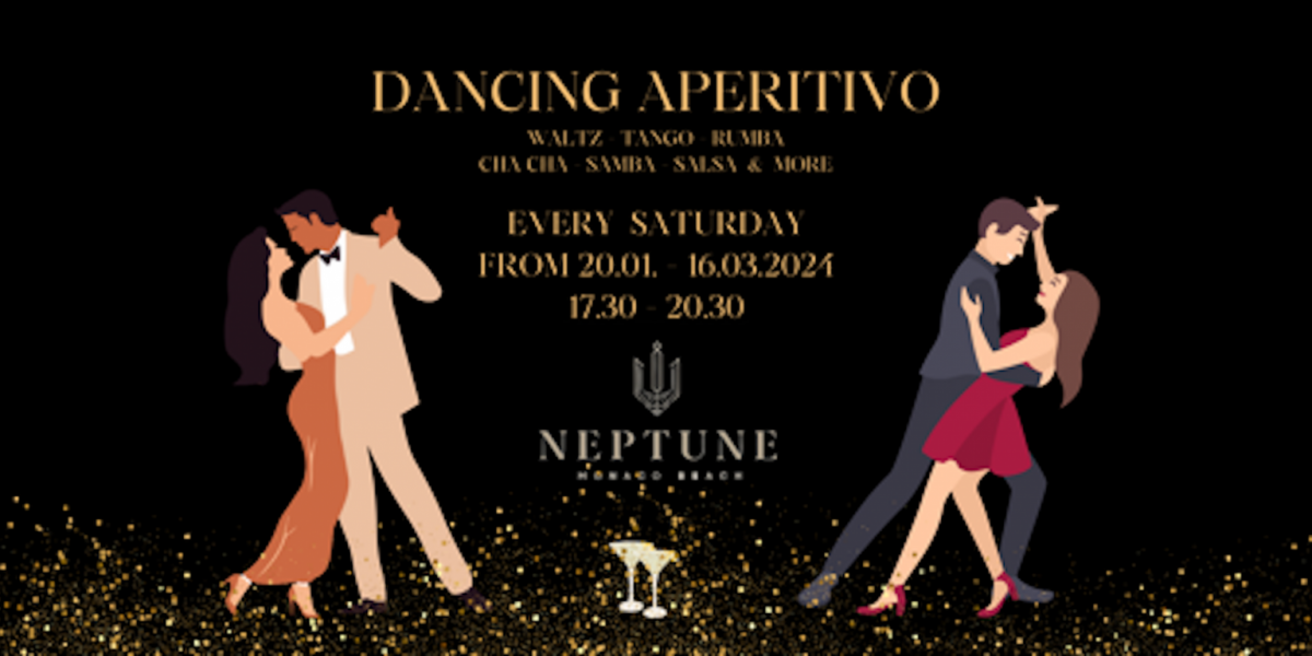 Del 20.1.2024 al 16.3.2024, Neptune y Monaco-Life organizan y ofrecen un "Aperetivo de baile" todos los sábados de 17:30 a 20:30 en el conocido Neptune, directamente en la playa Larvotto.