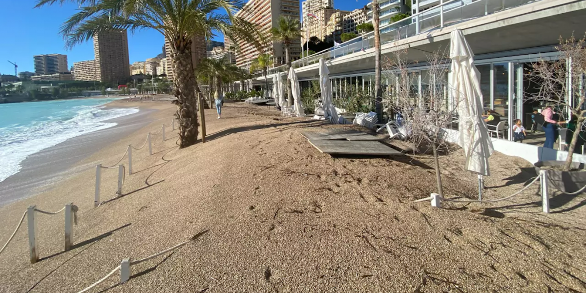 Terrazas de restaurantes en la playa arrasadas por las olas, muebles enterrados bajo la arena, estructuras rotas... La tormenta Domingos no perdonó al Principado el sábado por la noche. Y las olas sumergidas causaron estragos en la playa de Larvotto, donde varios comerciantes vieron sus instalaciones exteriores dañadas por el mar y la arena.