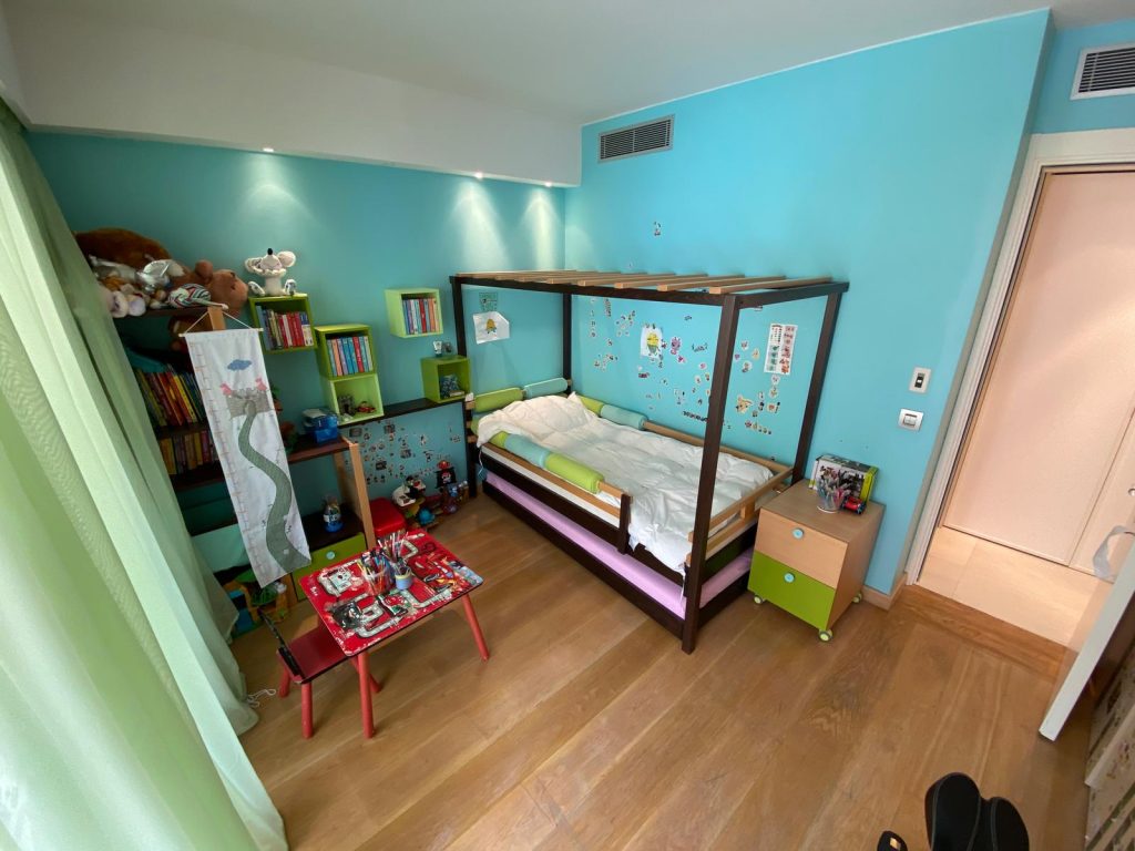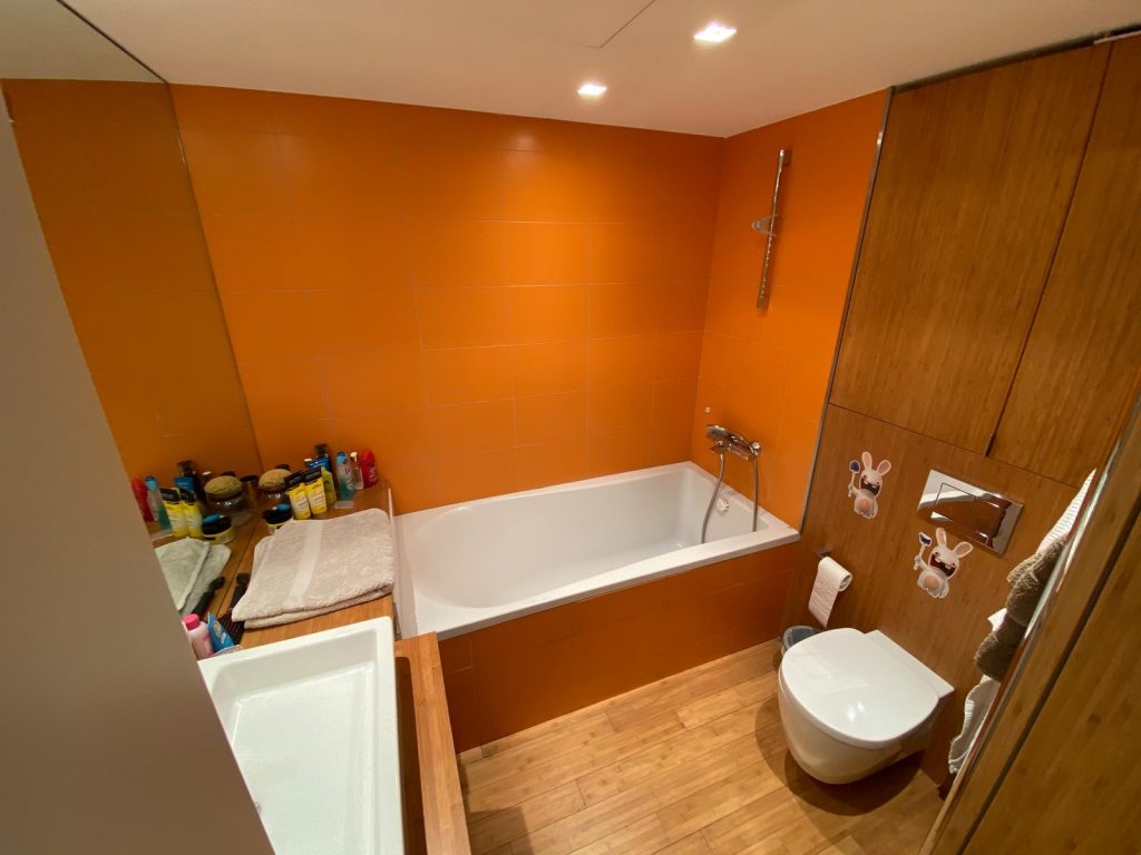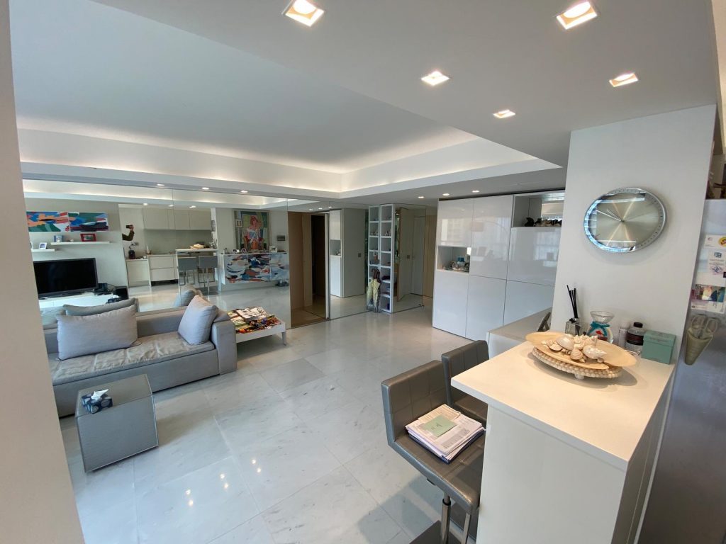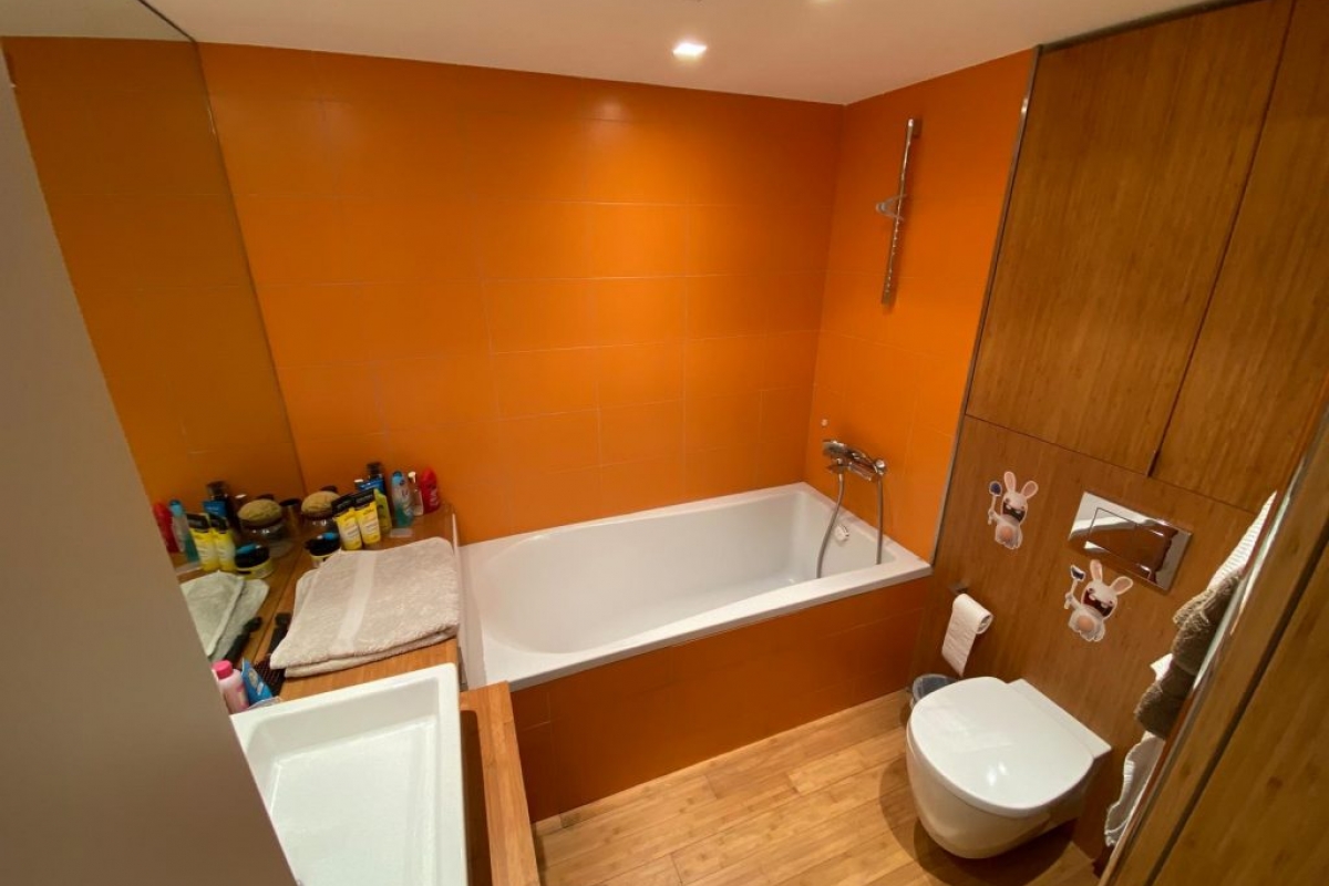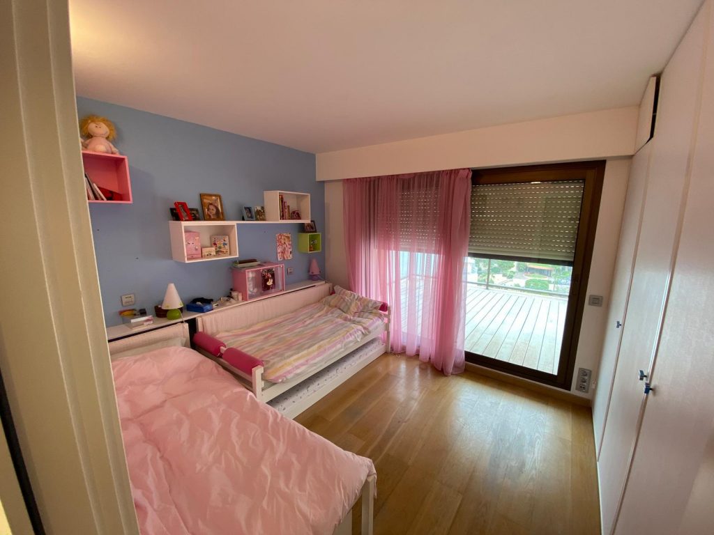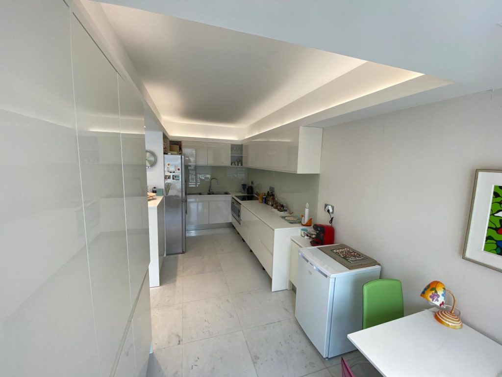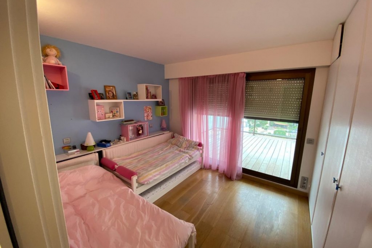 Composed of an entrance overlooking the bright living room boasts large glass-enclosed windows. A kitchen with small dining area gives direct access onto the large terrace that surrounds the entire apartment. The master bedroom with it’s en suite bathroom is located in extension of the living room.