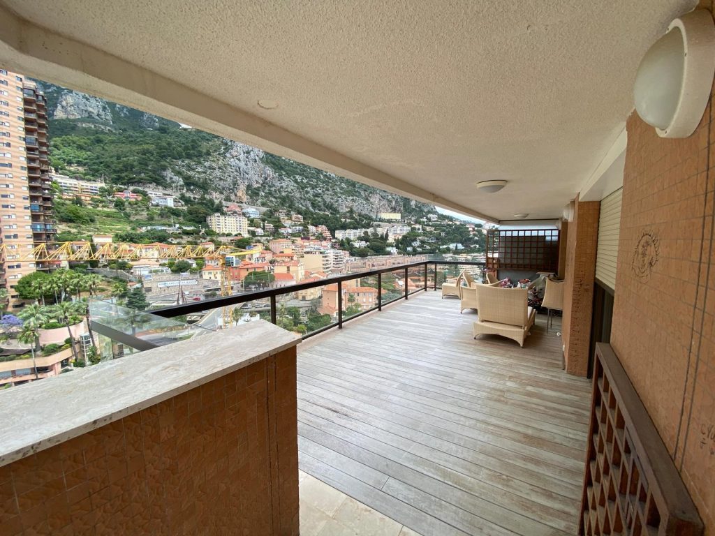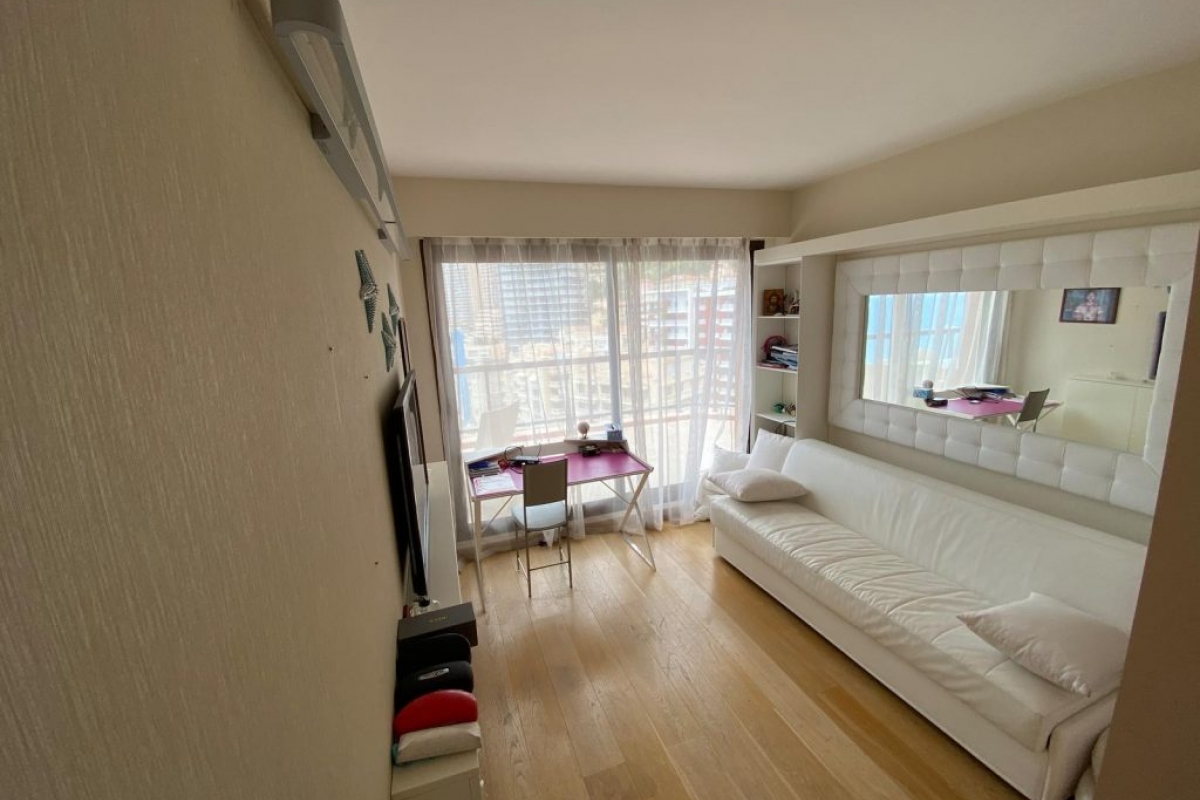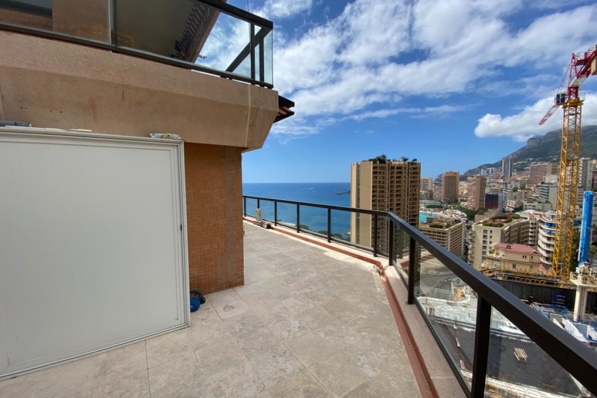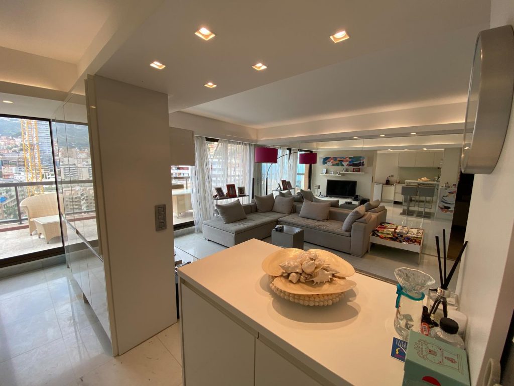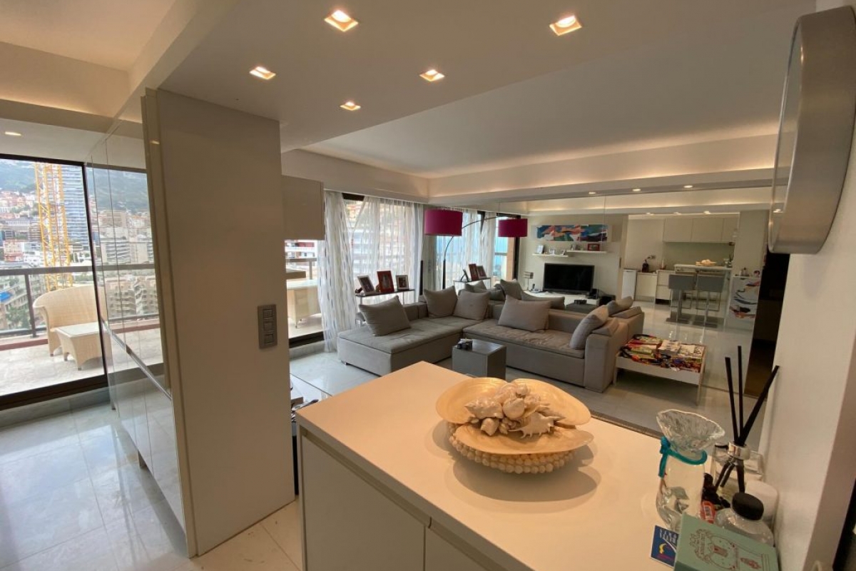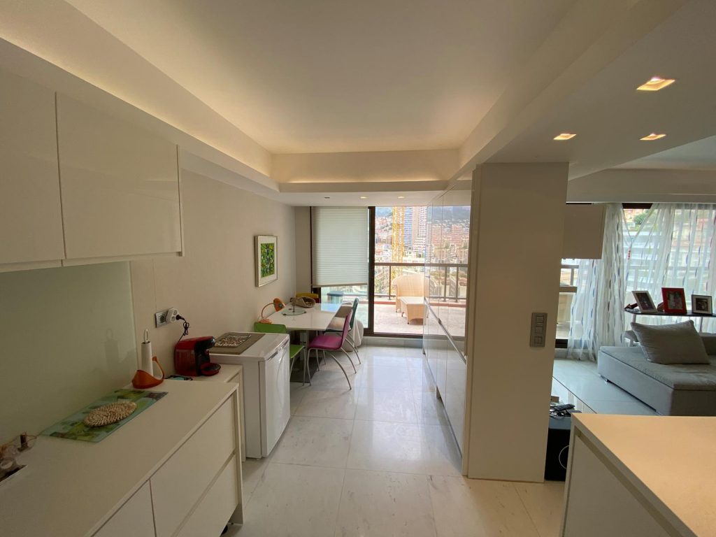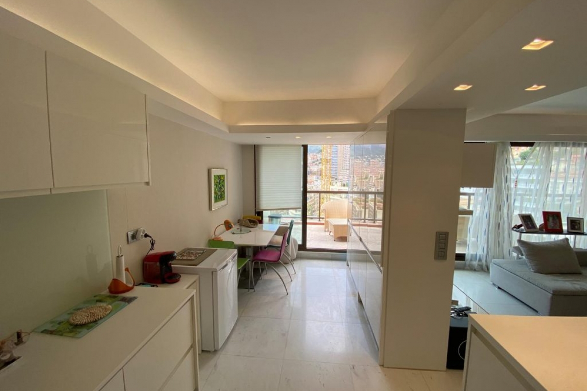 Composed of an entrance overlooking the bright living room boasts large glass-enclosed windows. A kitchen with small dining area gives direct access onto the large terrace that surrounds the entire apartment. The master bedroom with it’s en suite bathroom is located in extension of the living room.